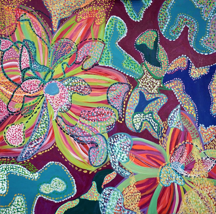 Drawing upon influences from Indonesian art and the batik making process, that  represent the intertwining of Indonesia’s cultural identity,  and the idea that Colors and designs can be  used as tools to express an individual’s creativity and spiritual beliefs, I combined these ideas into this series not only adopting the use of alternative color schemes as compared to that of nature-made land, I seek to bring to mind the ideas of space and congestion through the juxtaposition  of shapes and patterns.